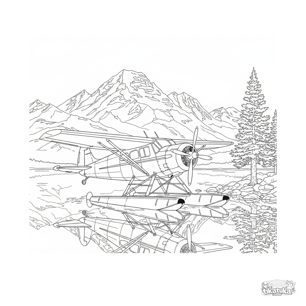 Página detalhada para colorir de um hidroavião de meados do século em um lago de montanha. Ilustração realista para crianças de 10 a 12 anos.
