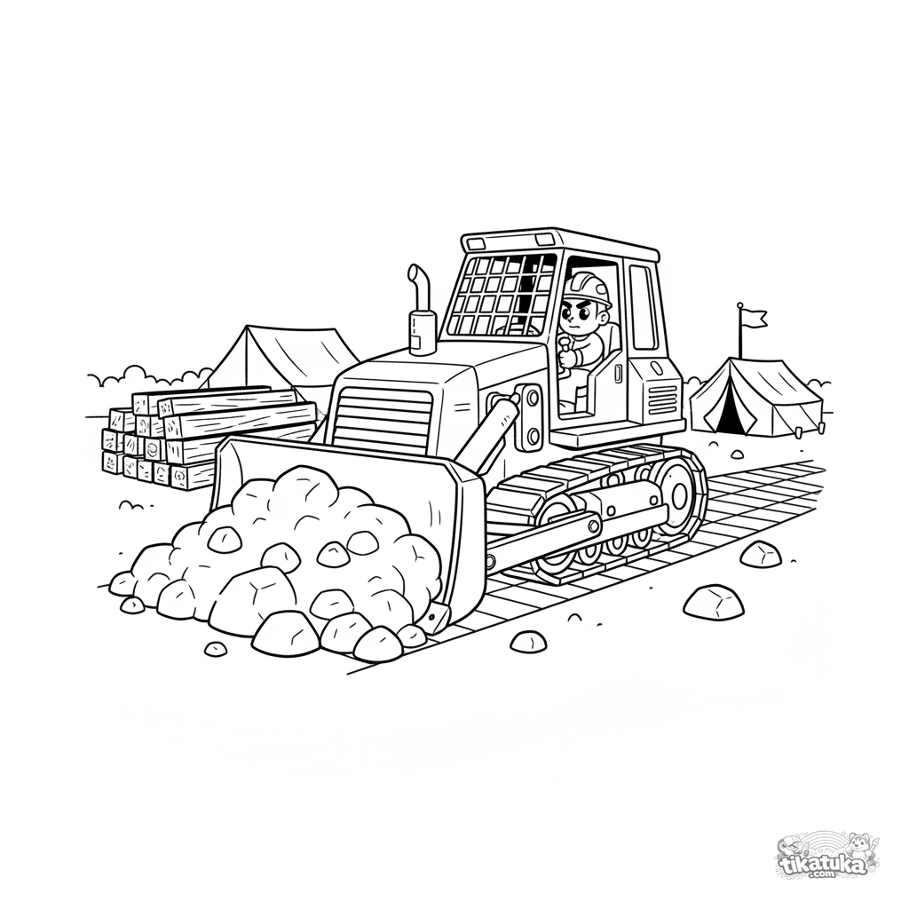 Página para colorir para crianças de 7-9 anos: um poderoso bulldozer militar limpando e nivelando o terreno na borda do quartel-general de campo. O operador na cabine controla a máquina.