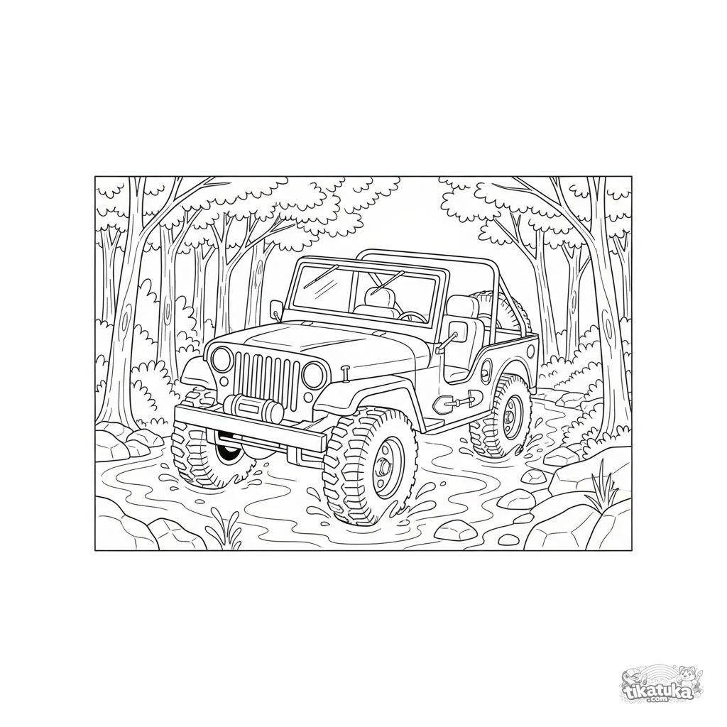 Página para colorir para meninos de 4-6 anos com um jipe militar. O veículo está dirigindo através de um riacho rochoso raso numa floresta, criando respingos.