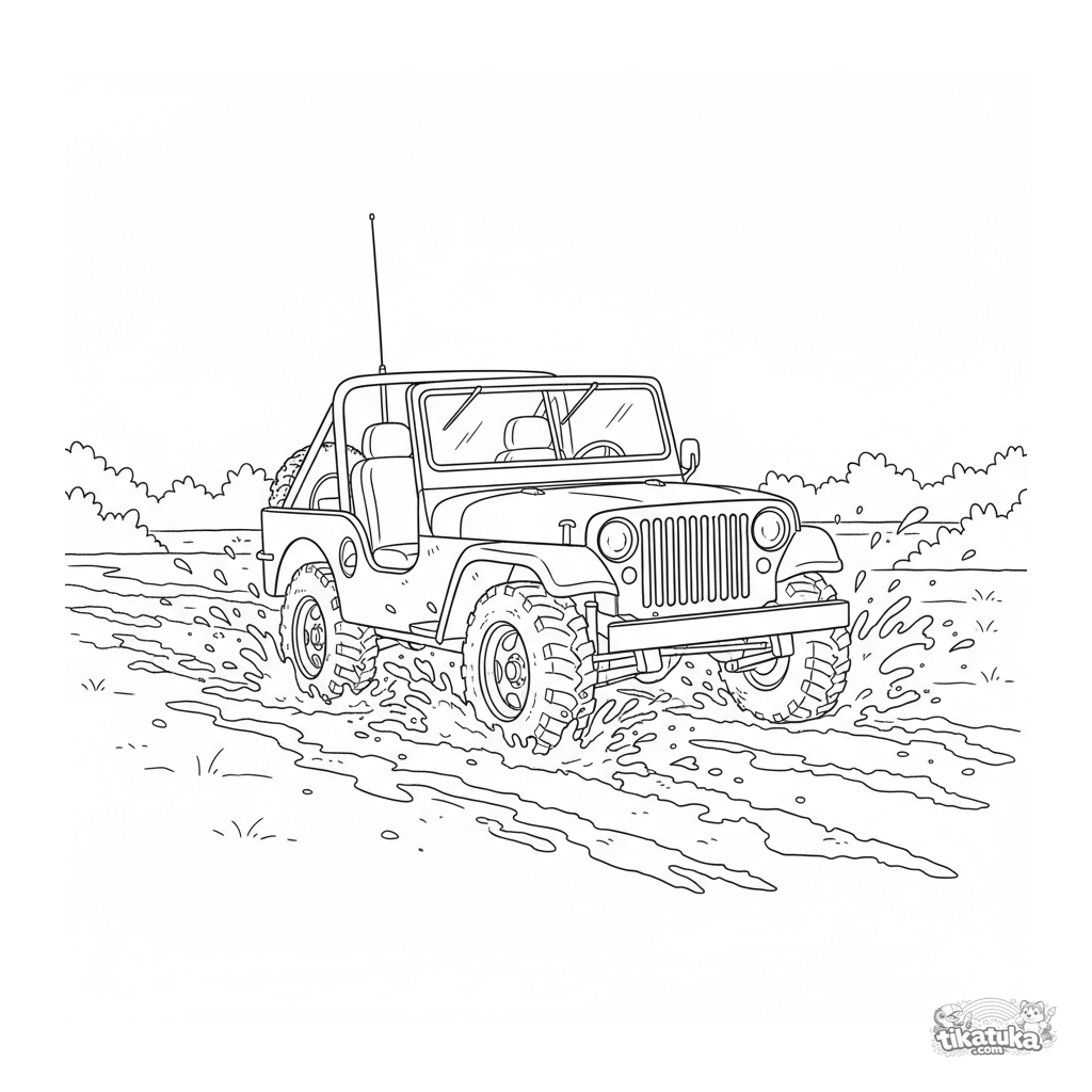 Página para colorir de um jipe militar atravessando um campo lamacento. Para meninos de 4 a 6 anos. Cena de veículo com ação.