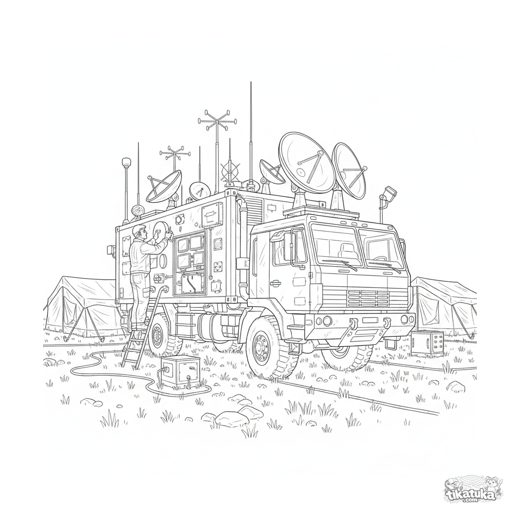 Página para colorir para crianças mais velhas de 10-12 anos: um caminhão centro de comando móvel detalhado coberto de antenas e pratos. Um técnico em uma escada ajusta o equipamento perto das barracas do quartel-general.