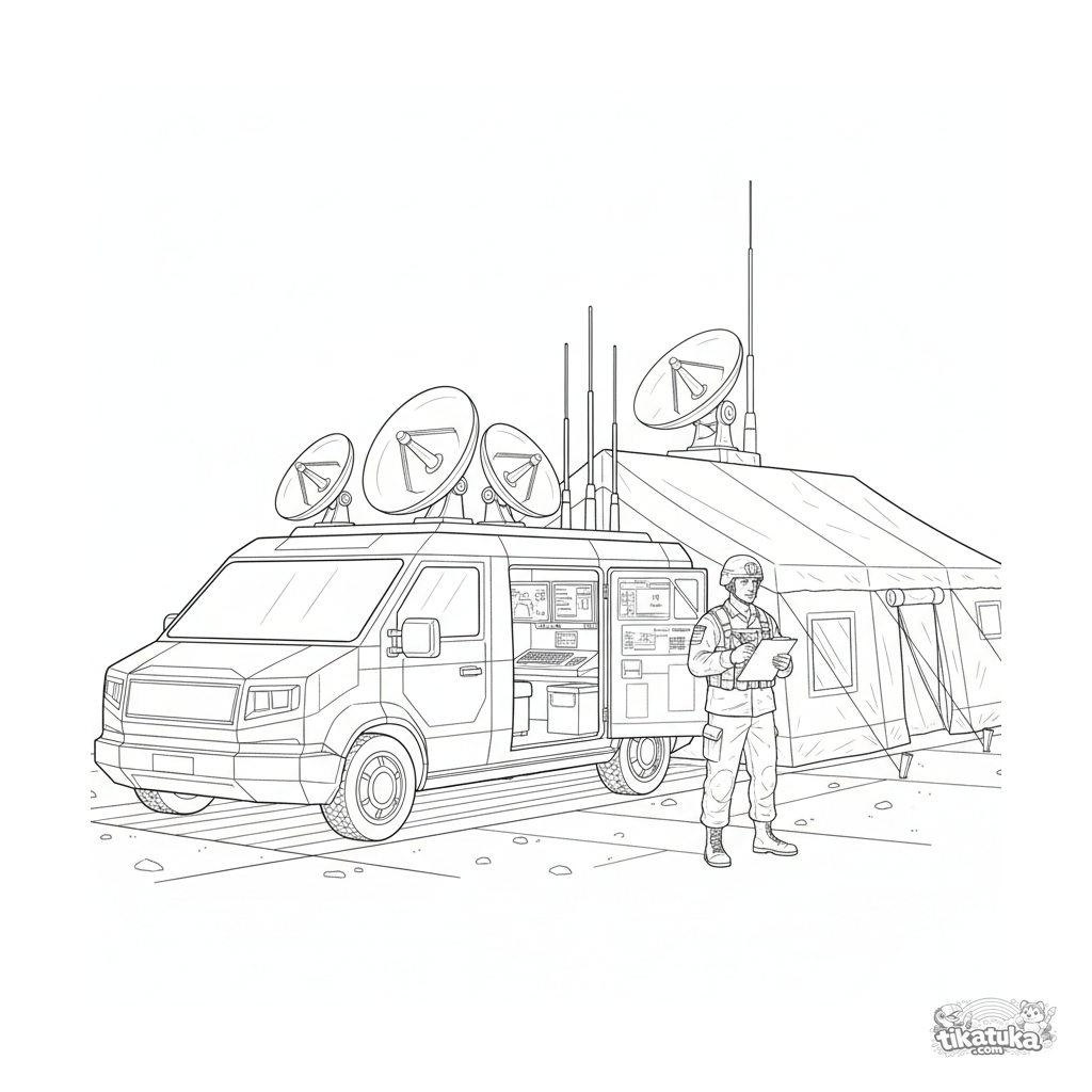 Página para colorir para crianças maiores 10-12: uma van centro de comando móvel detalhada com antenas perto de uma barraca de comando. Painel lateral aberto.