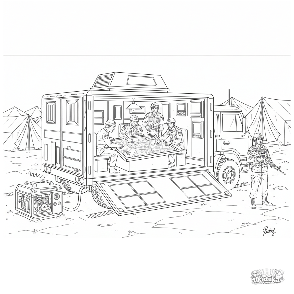 Página para colorir complexa de um centro de comando móvel com laterais expandidas. Para crianças mais velhas de 10 a 12 anos.