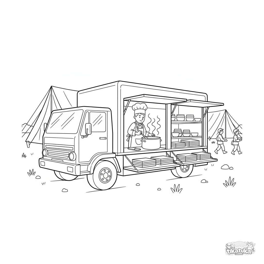 Página para colorir para crianças de 4-6 anos: um grande caminhão de cozinha de campo prepara comida para soldados perto das barracas do quartel-general. Cena clara e envolvente.