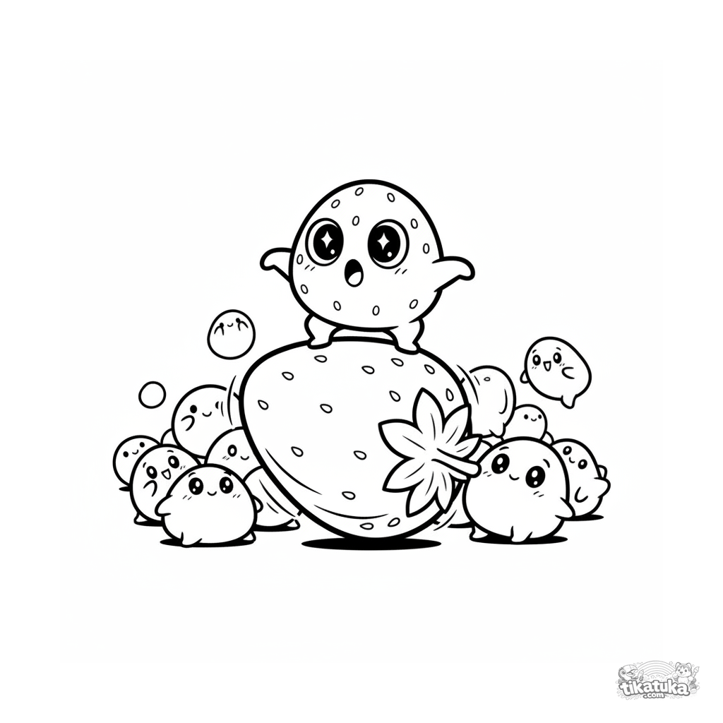 Página para colorir para crianças 4-6 anos: um mochi engraçado equilibrando-se num morango rolante. Cena dinâmica e divertida em estilo retrô anos 90.