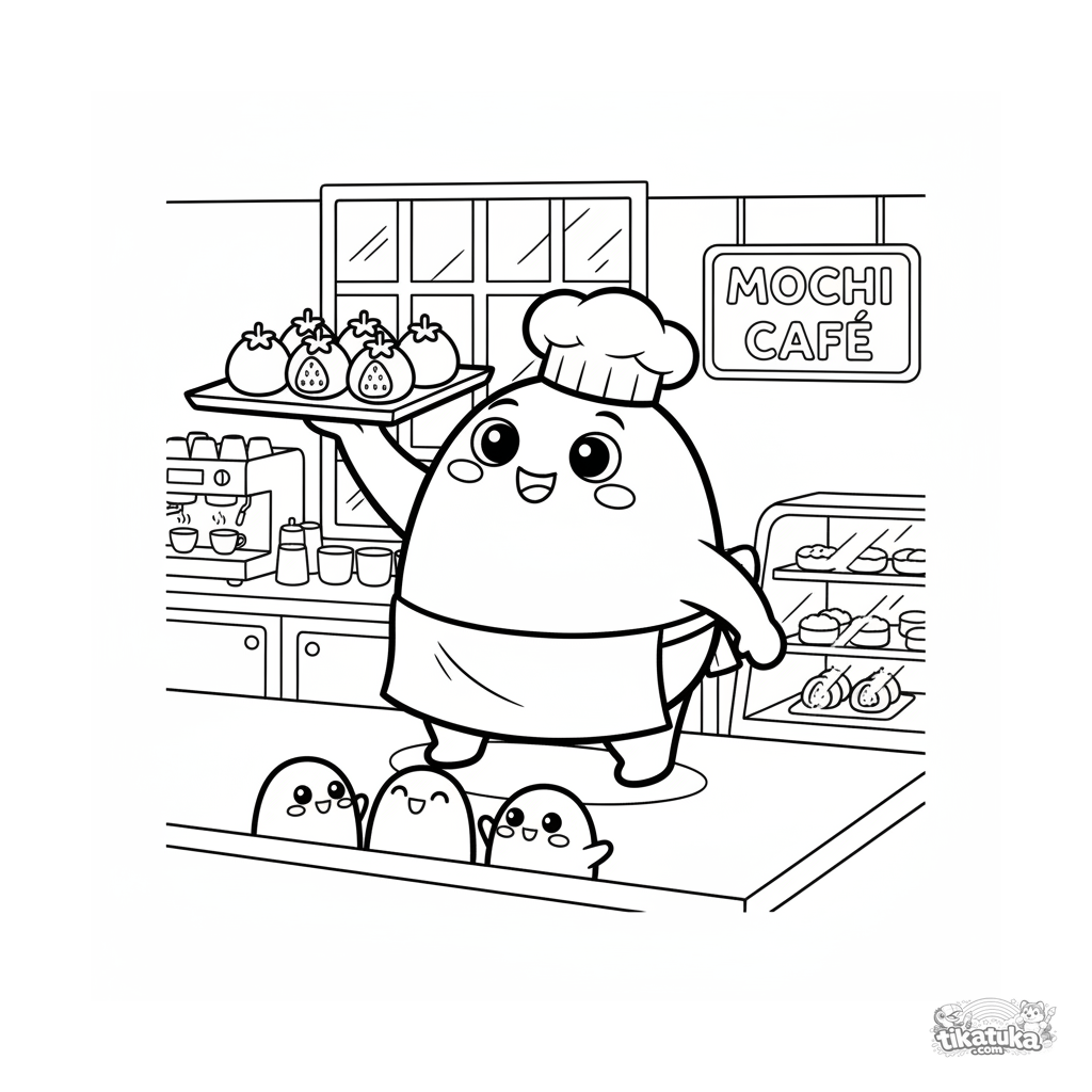 Página para colorir para crianças 7-9: um chef mochi com chapéu e avental apresenta uma bandeja de mochi de morango em um café. Cena detalhada.