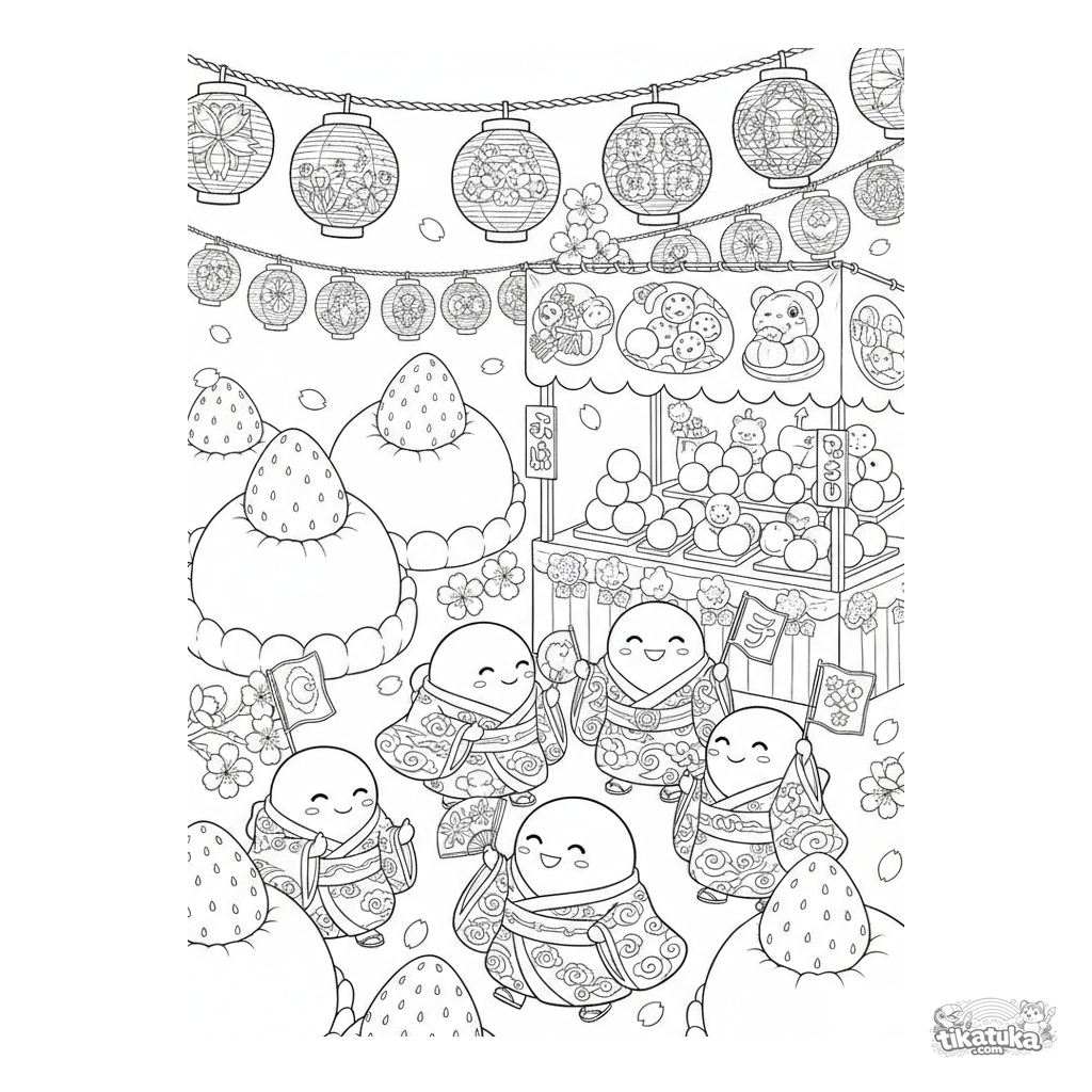 Página para colorir complexa para crianças mais velhas 10-12: cena detalhada de festival com mochi, lanternas de papel, barraca e personagens celebrando. Muitos elementos.
