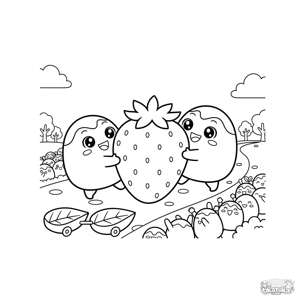 Página para colorir para crianças de 4 a 6 anos: dois mochis amigos rolando um morango gigante. Cena fofa sobre amizade e cooperação.