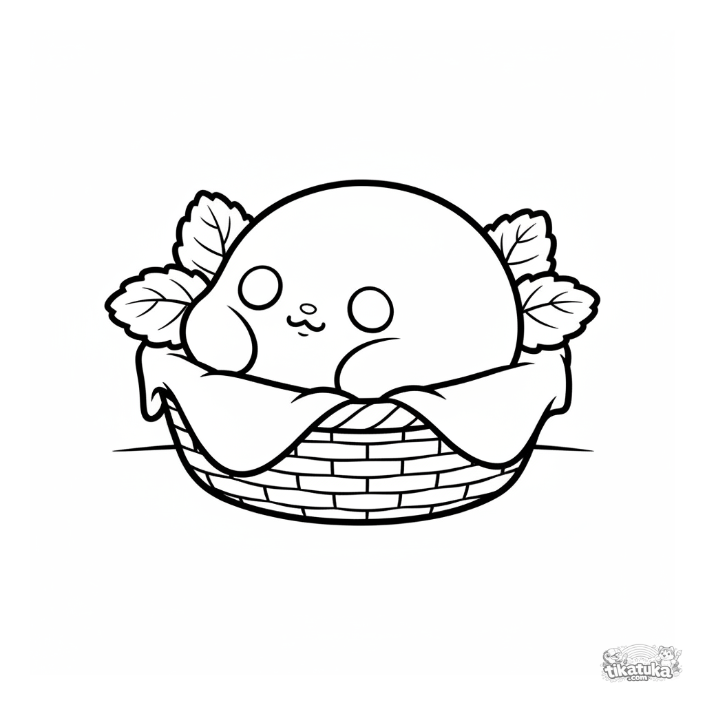 Um mochi fofo dorme numa cesta. Página muito simples com formas grandes para os mais pequenos de 2-3 anos, desenvolvendo habilidade de colorir.