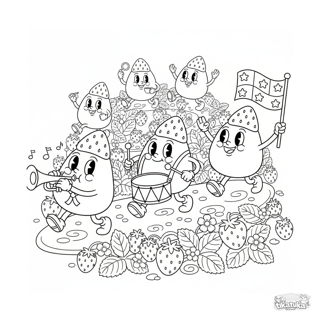 Página intrincada para colorir para crianças de 10-12 anos. Um desfile de mochi músicos marchando. Muitos detalhes, instrumentos, poses dinâmicas estilo retrô.