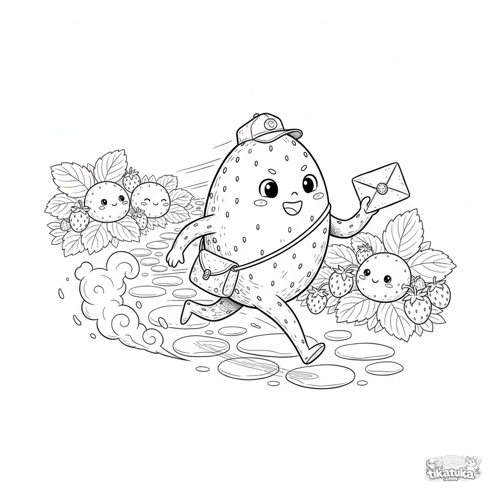 Página para colorir detalhada para crianças de 10-12 anos: um mochi mensageiro correndo para entregar uma carta por um caminho de jardim. Cena com movimento e fundo de plantas de morango.