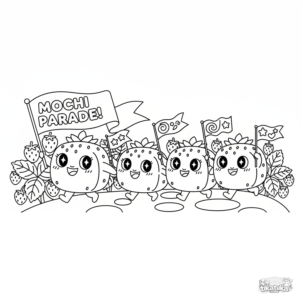 Página para colorir para crianças de 7-9 anos: um alegre desfile de mochi de morango com uma bandeira. Cena dinâmica com múltiplos personagens e clima festivo.