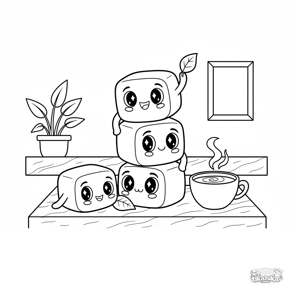 Página para colorir para pré-adolescentes 7-9: mochi brincalhões construindo uma torre instável no balcão de um café. Cena dinâmica com personagens expressivos.