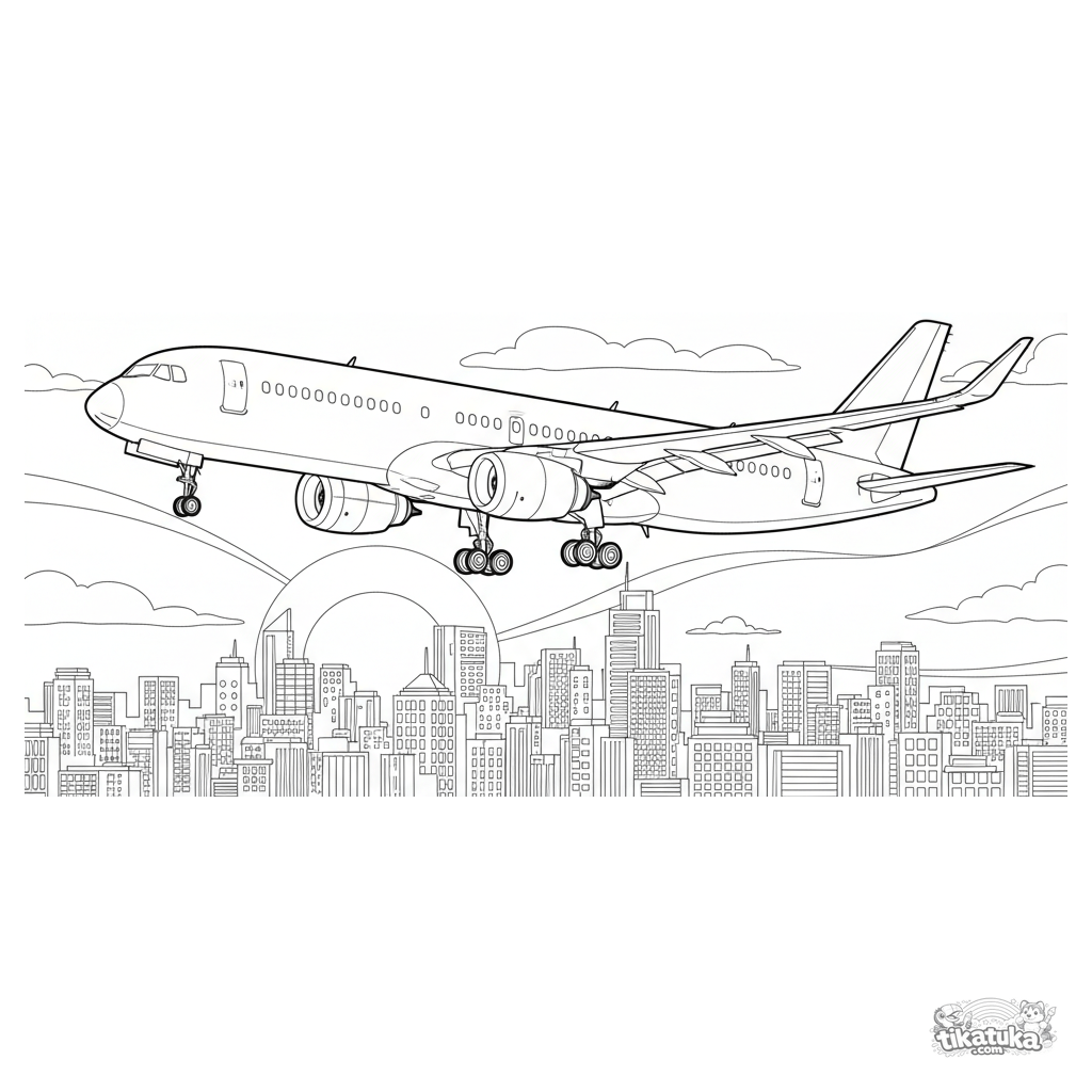 Uma página para colorir detalhada de um avião moderno em aproximação de pouso sobre uma cidade ao anoitecer, com trem de pouso abaixado e luzes da cidade. Para 10-12 anos.