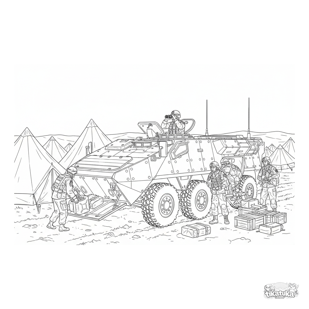 Página para colorir detalhada para 10-12 anos: um transporte blindado moderno em patrulha perto de um quartel-general de campo. Soldados descarregam suprimentos.