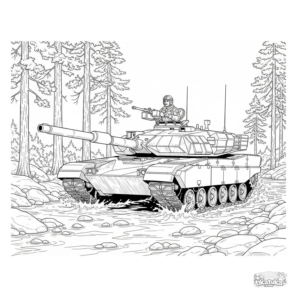 Página detalhada para colorir de um tanque moderno atravessando um rio. Para meninos de 7 a 12 anos. Cena com respingos de água, floresta e veículo detalhado.