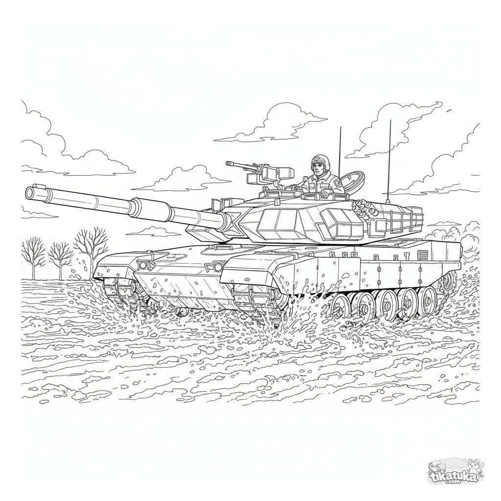 Página para colorir difícil para meninos de 7 a 12 anos com um tanque de batalha moderno. O veículo blindado está atravessando um campo lamacento, deixando marcas de esteira, com um comandante visível na escotilha.
