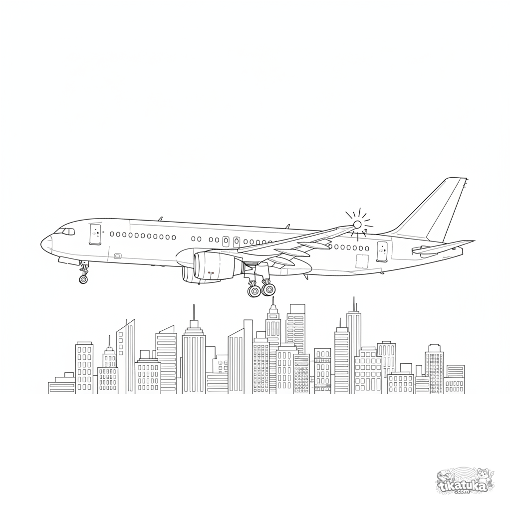 Página para colorir para crianças mais velhas 10-12: um avião comercial em aproximação de pouso sobre uma cidade noturna. Traços detalhados, elementos técnicos.
