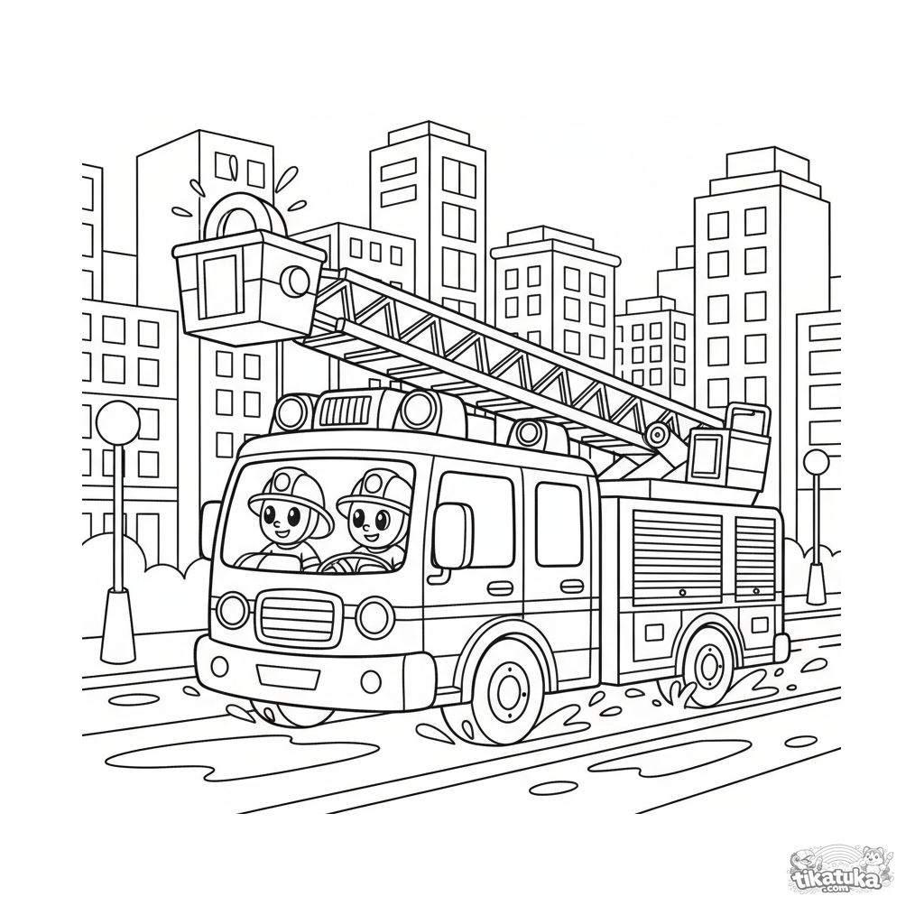 Página para colorir para meninos: um caminhão de bombeiros moderno com luzes e sirene desce uma rua molhada. Bombeiros visíveis na cabine.