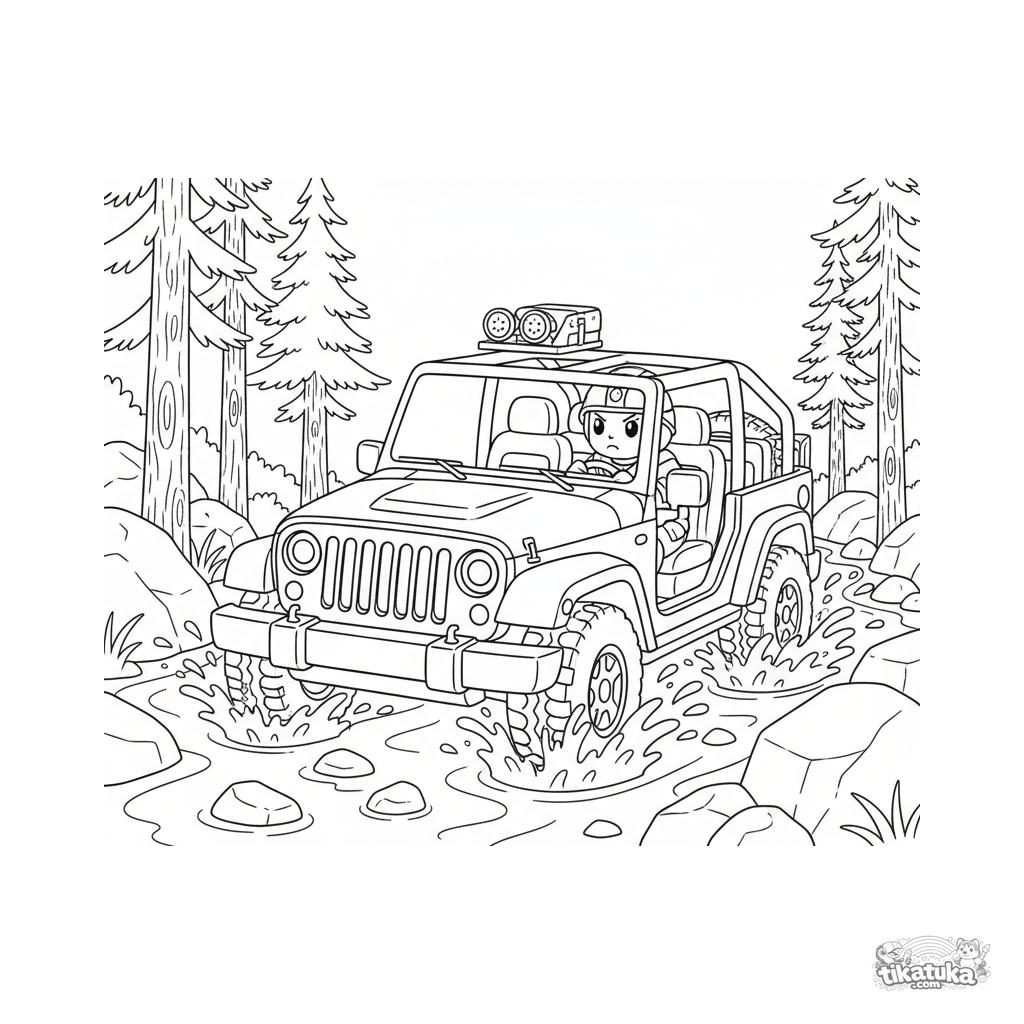 Página para colorir de um jipe militar moderno atravessando um riacho na floresta. Para meninos de 7 a 12 anos. Cena detalhada com respingos de água.