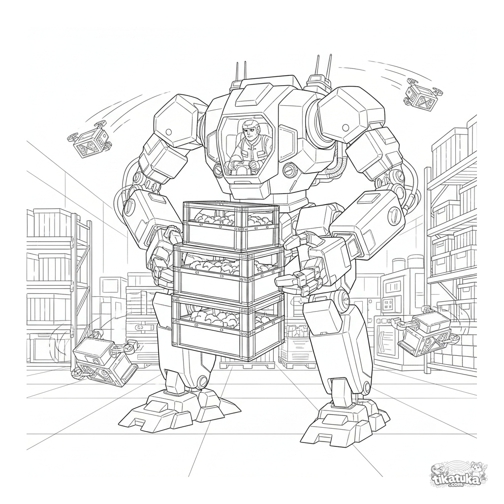 Página para colorir detalhada para 10-12 anos: um mecânico modular intrincado com braços hidráulicos levanta caixas em um armazém. Estilo técnico de diagrama.