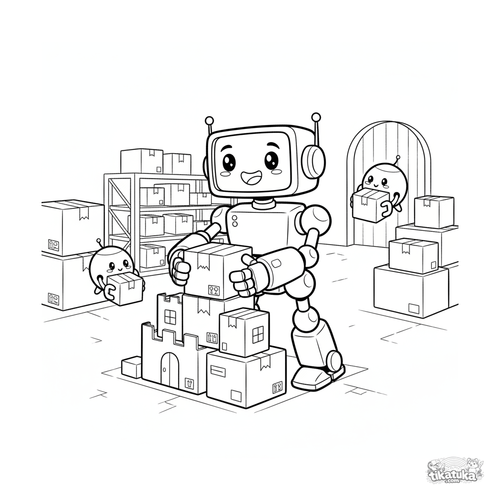 Página para colorir para crianças de 7-9 anos: um robô modular feito de partes cúbicas com juntas magnéticas constrói uma fortaleza com caixas em um espaço aberto do armazém, assistido por pequenos drones ajudantes.