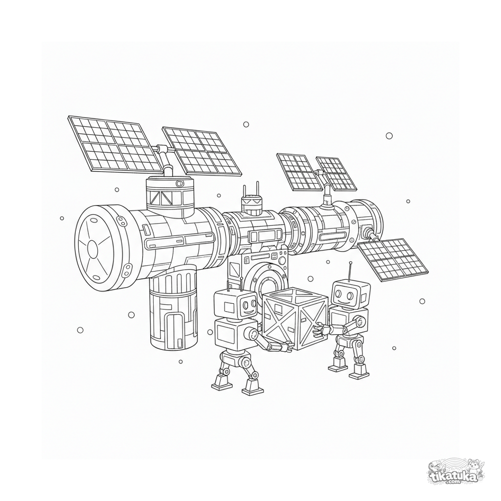 Página para colorir para 10-12 anos: uma estação espacial modular detalhada no espaço, com robôs realizando operações de acoplamento. Estilo de diagrama técnico.