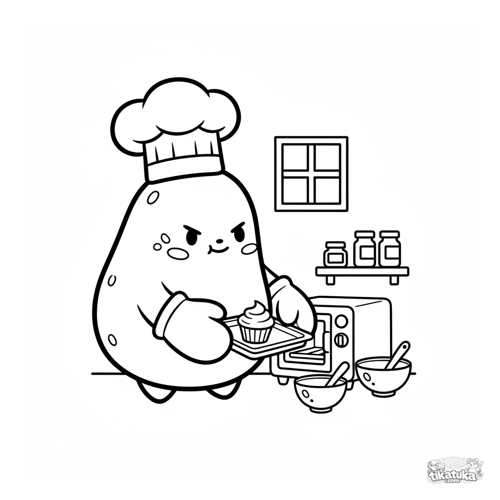 Página para colorir para crianças: um monstro com chapéu de chef e luvas de forno coloca um cupcake em um forno miniatura em uma cozinha pequena. Cena engraçada.
