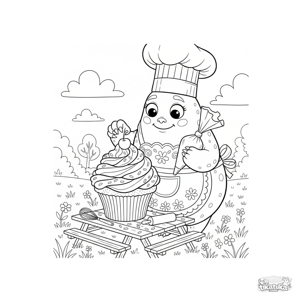 Página detalhada para colorir para crianças de 10-12 anos: um monstro com avental e chapéu de chef decora um cupcake gigante em uma mesa de piquenique. Estilo realista de livro de histórias, muitas ferramentas e detalhes.