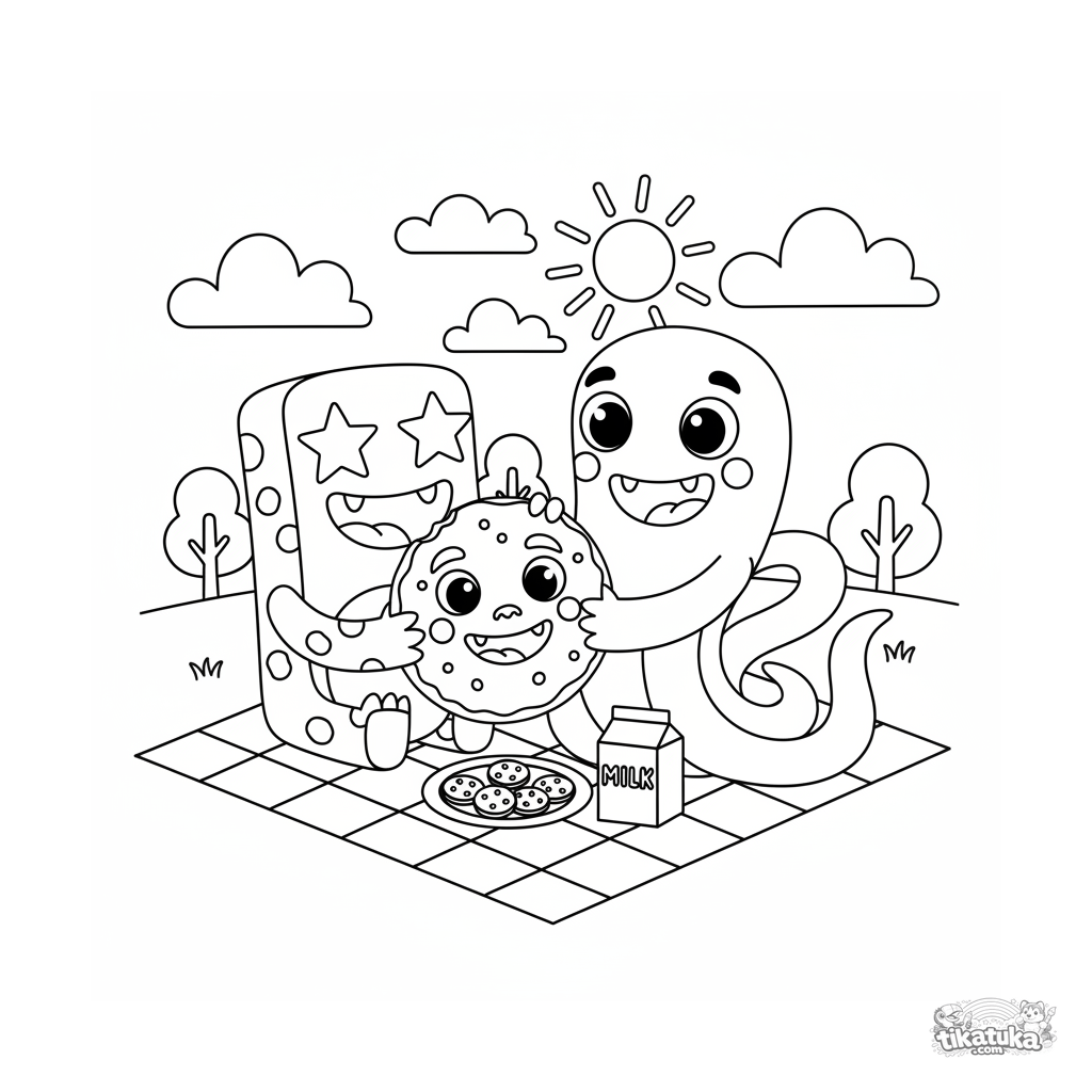 Página para colorir para crianças de 4 a 6 anos: dois monstros fofos compartilham felizes um biscoito gigante em um piquenique. Cena sobre amizade e guloseimas.