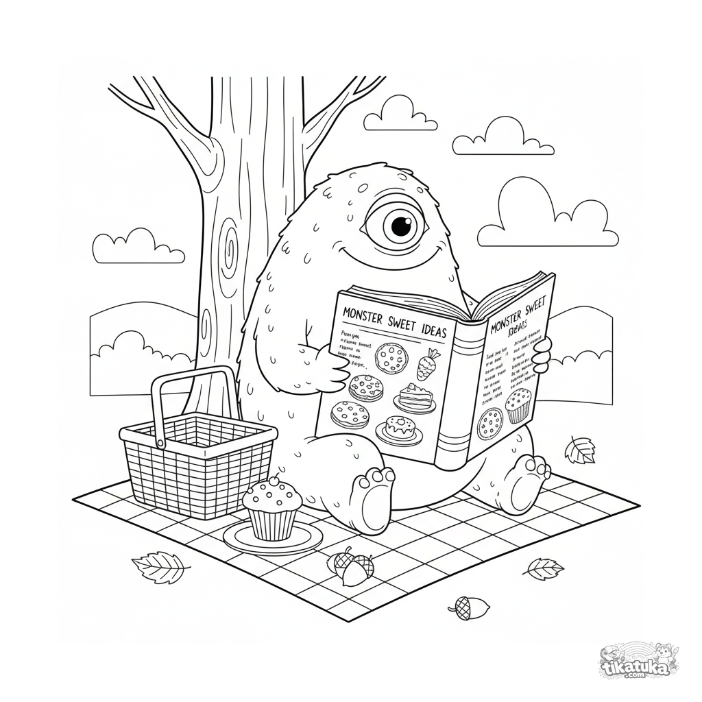 Página para colorir detalhada em estilo realista: um monstro lendo um grande livro de receitas sob uma árvore em um piquenique. Para 10-12 anos.