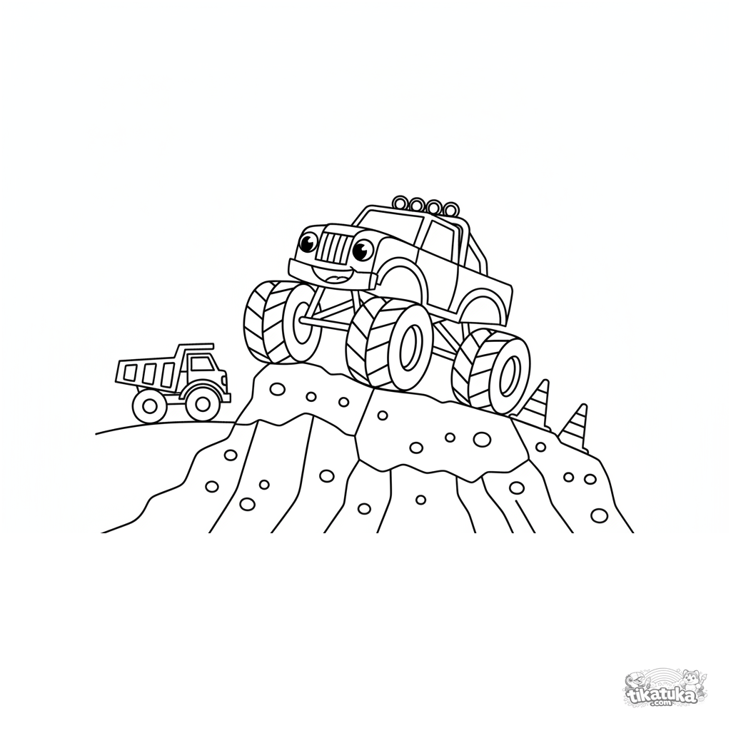 Página para colorir para meninos: um monster truck poderoso sobe uma colina de terra. Cena dinâmica com rodas grandes.