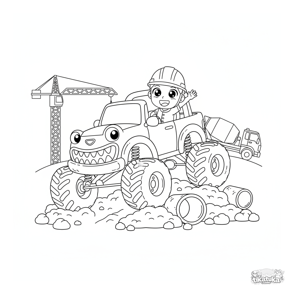 Página para colorir para crianças de 4-6 anos: um poderoso monster truck conquista uma pilha de terra em um canteiro de obras. Cena dinâmica com rodas grandes e fundo simples para colorir facilmente.