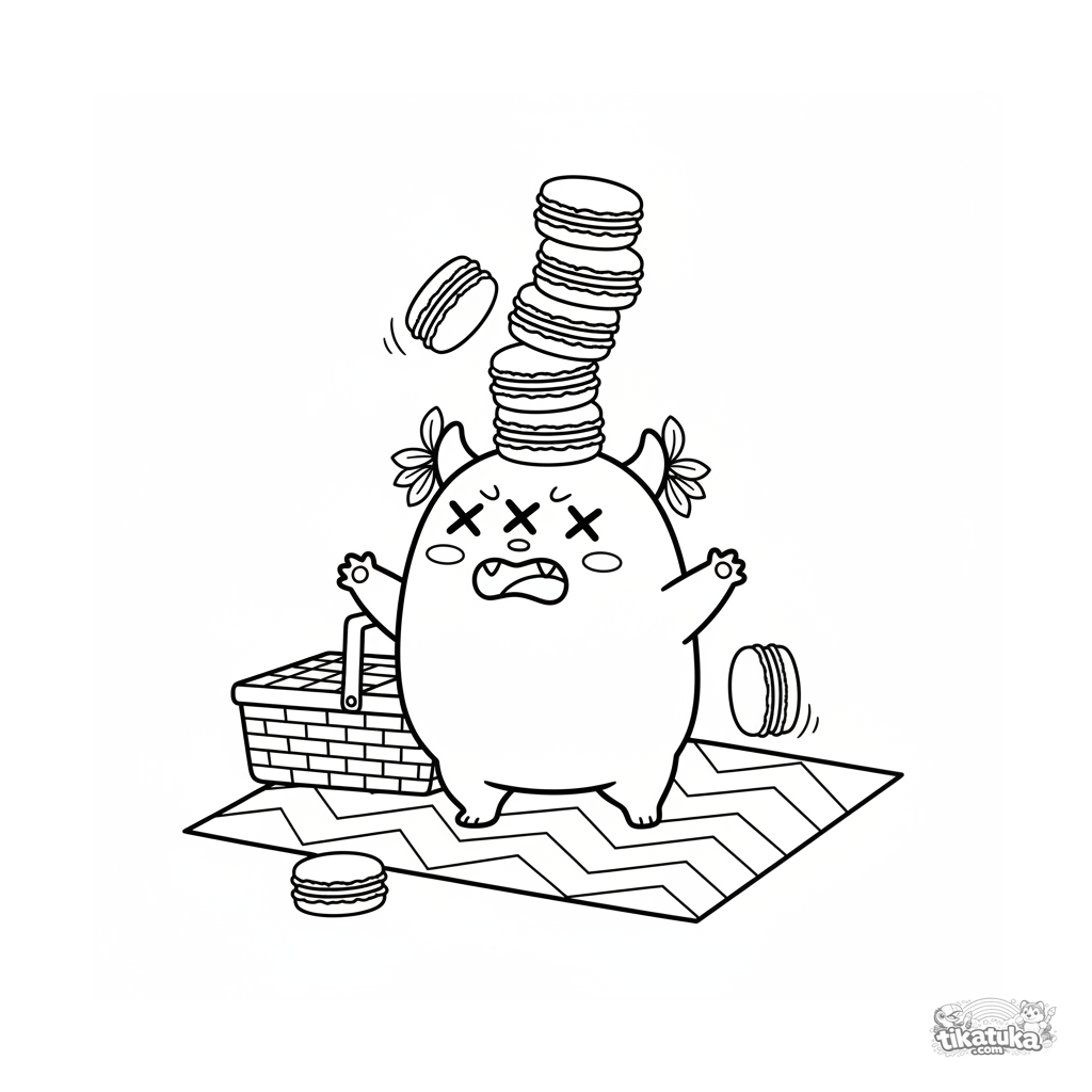 Página para colorir para crianças 7-9: um monstro engraçado com olhos em X tenta equilibrar uma torre de macarons em um piquenique. Cena dinâmica e humorística.