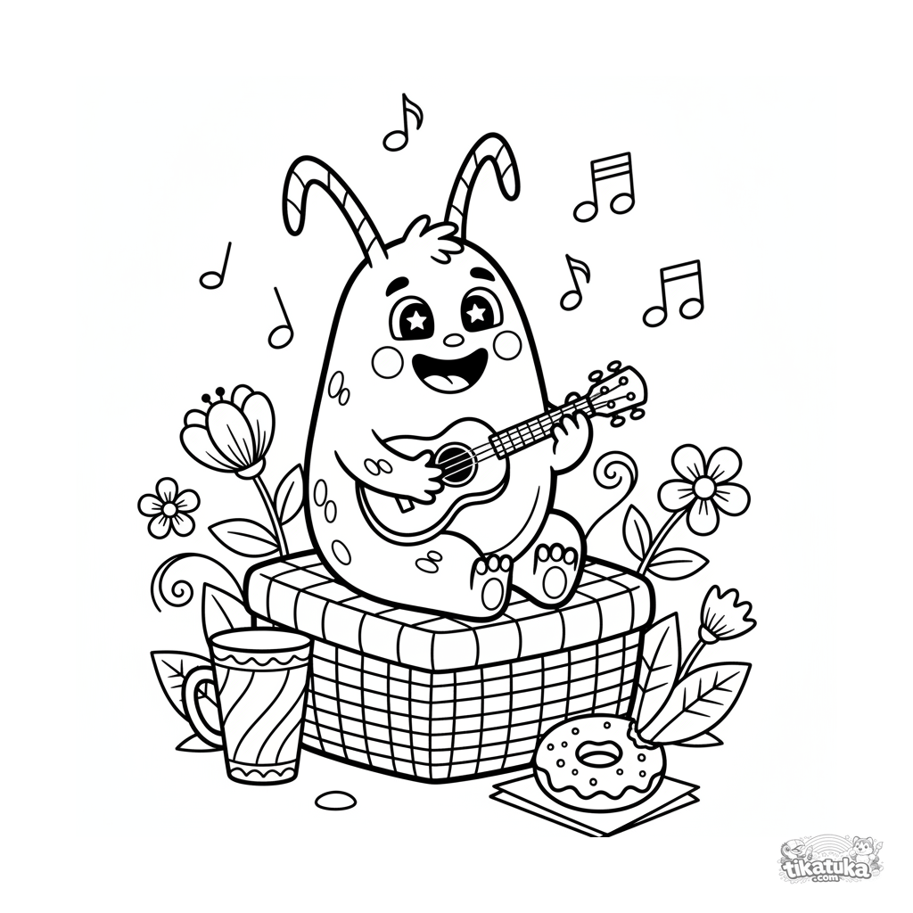 Página para colorir para crianças 7-9: um monstro em forma de pêra tocando ukulele sentado em uma cesta de piquenique. Cena musical divertida.