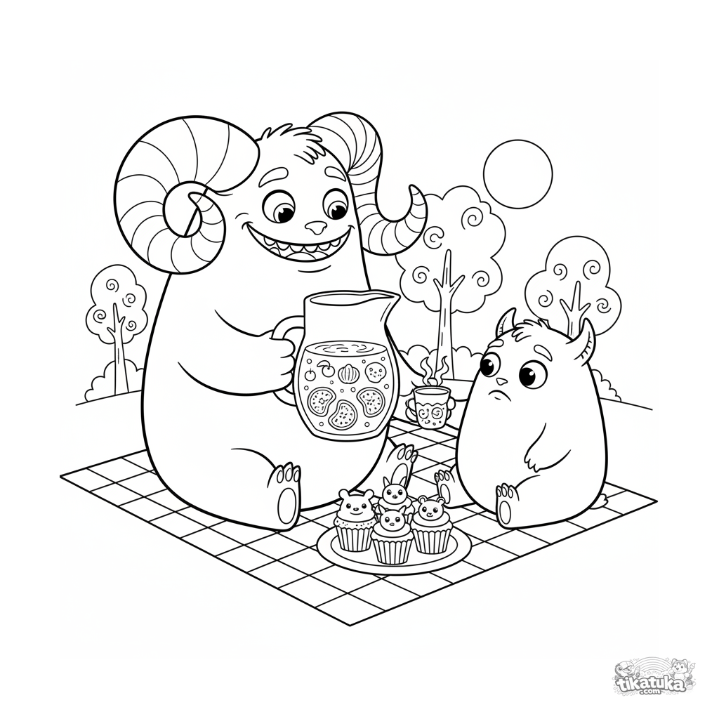 Página para colorir para crianças de 7-9 anos: um monstro com chifres encaracolados compartilhando ponche com um amigo em um piquenique. Cena calorosa.