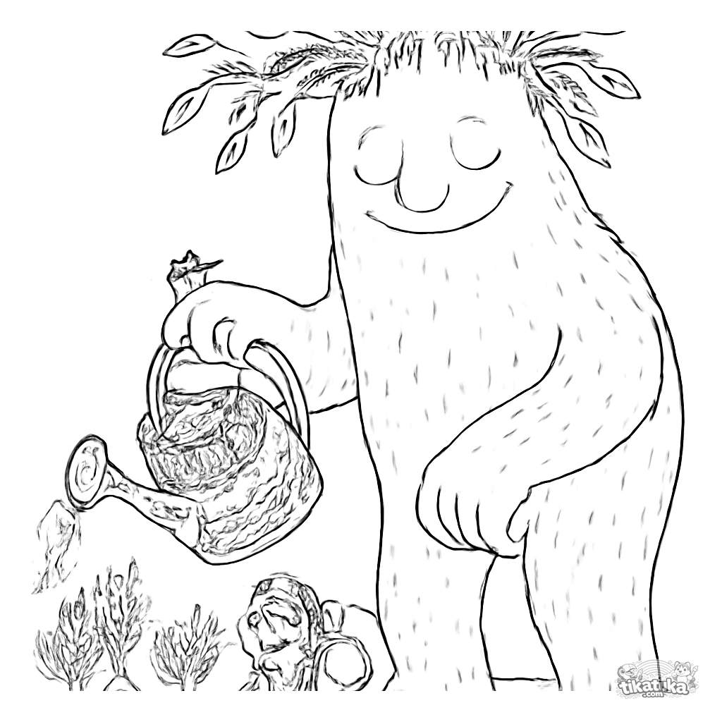 Página para colorir de um monstro com cabelo de vinha regando uma horta. Para crianças de 6 a 9 anos.