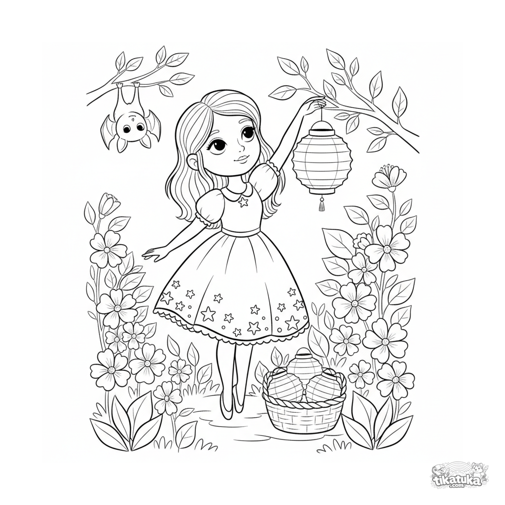 Página para colorir para crianças 4-6: uma princesa da lua pendura lanternas de papel em um jardim noturno. Vestido estrelado, flores, um morcego amigável.