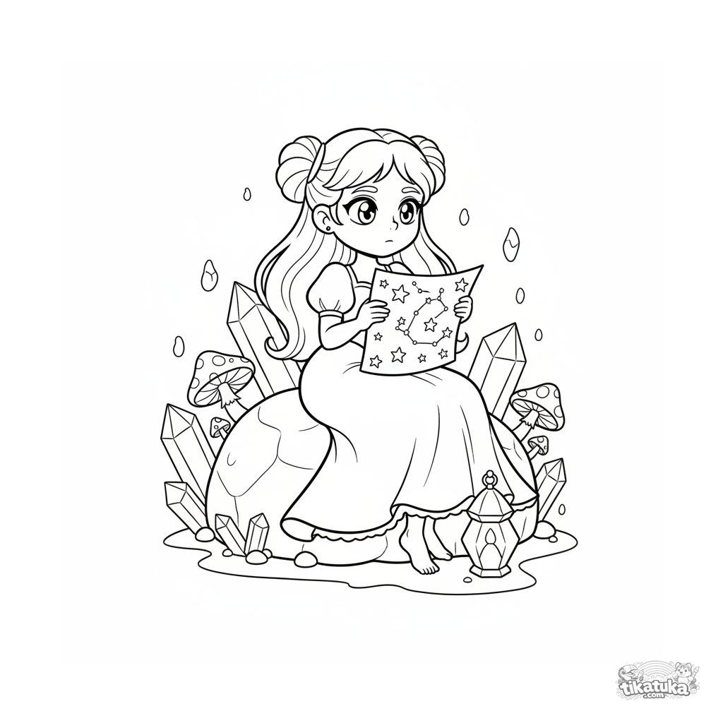 Página para colorir para 4-6 anos: uma princesa da lua lê mapas estelares em uma caverna de cristal brilhante. Cristais bonitos, olhos grandes e expressivos.