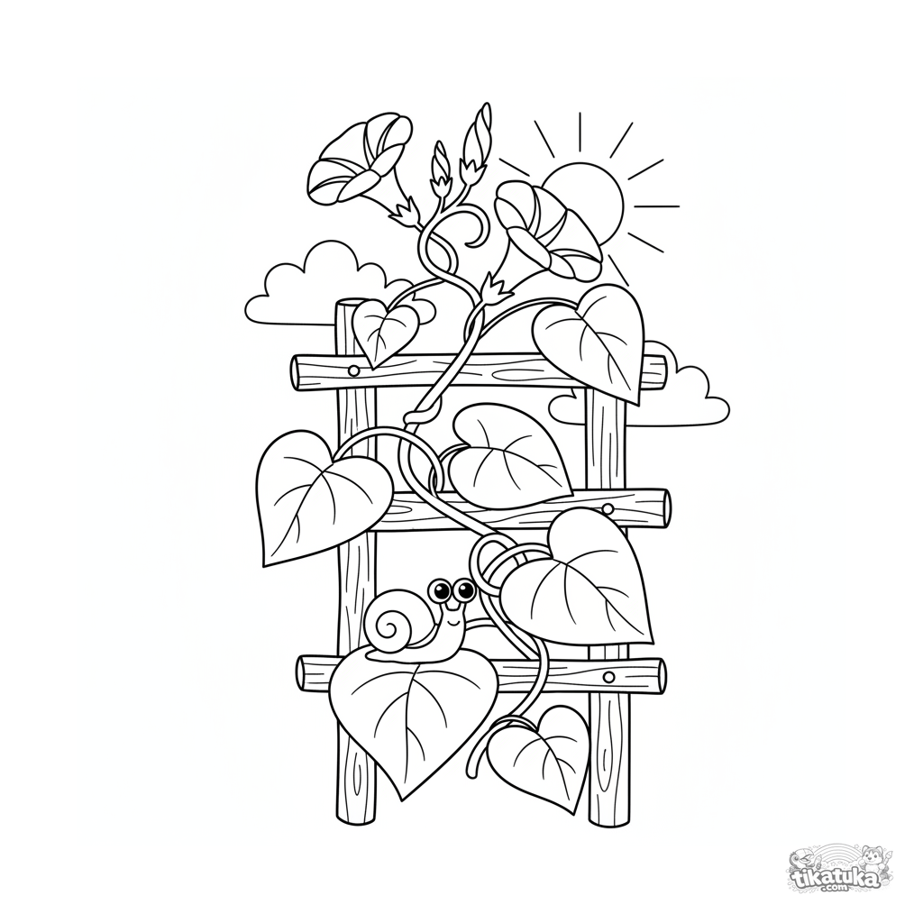 Página para colorir para crianças 4-6: uma trepadeira de glória-da-manhã com flores de trombeta em uma treliça. Silhuetas nítidas e detalhes equilibrados.