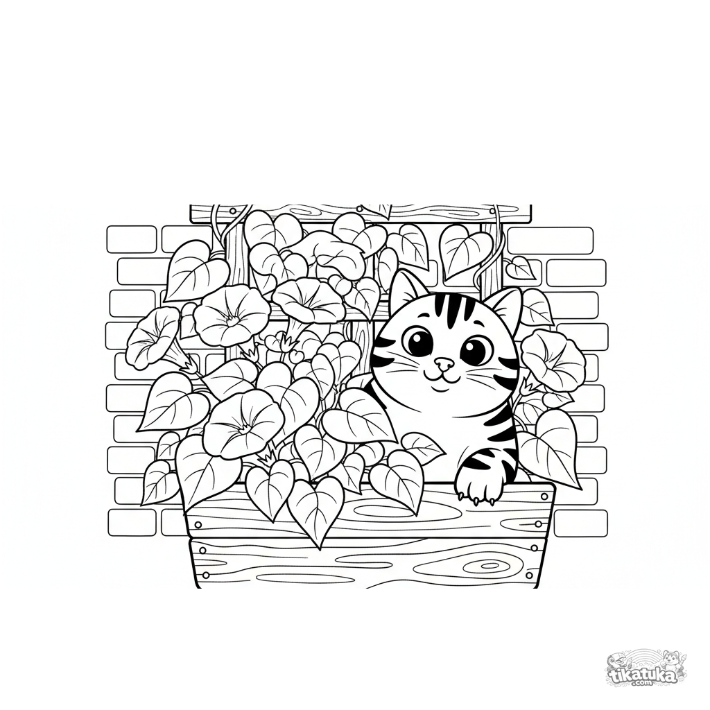 Página para colorir para crianças 4-6: uma trepadeira de glória-da-manhã florescendo em uma jardineira de madeira, um gatinho curioso espiando.