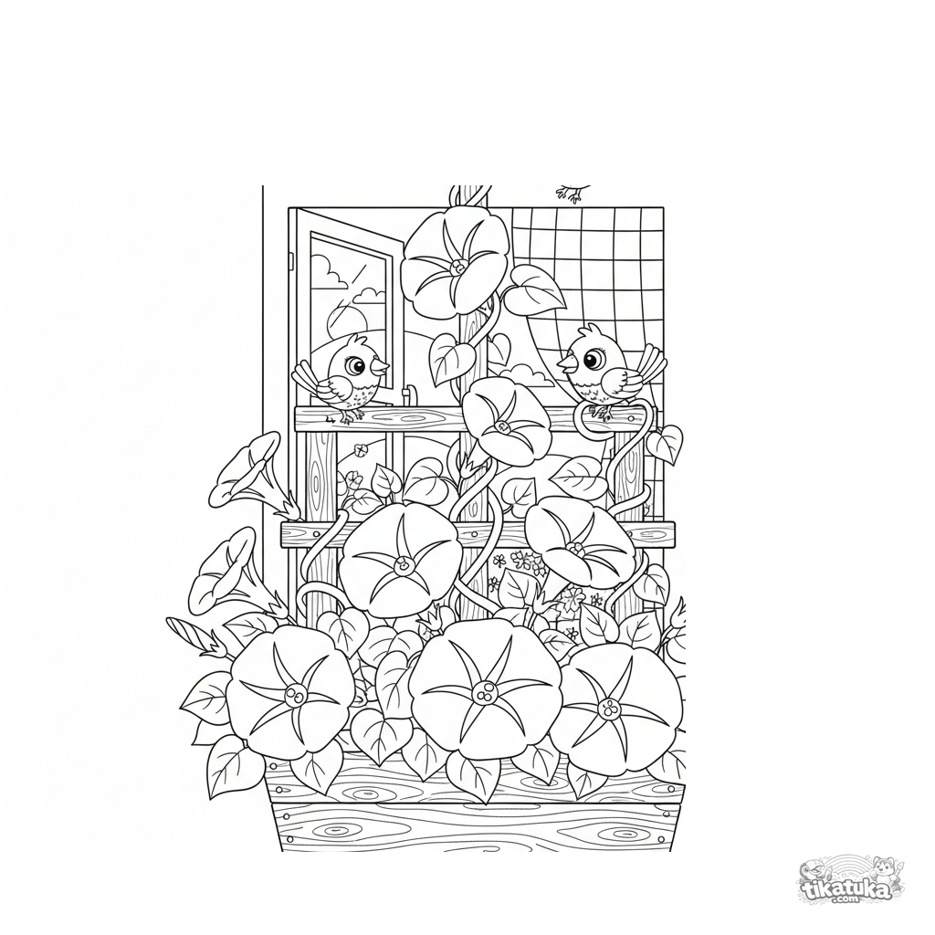 Página para colorir para crianças 4-6: flores glória-da-manhã sobem por uma treliça de uma caixa de janela. Cena aconchegante.