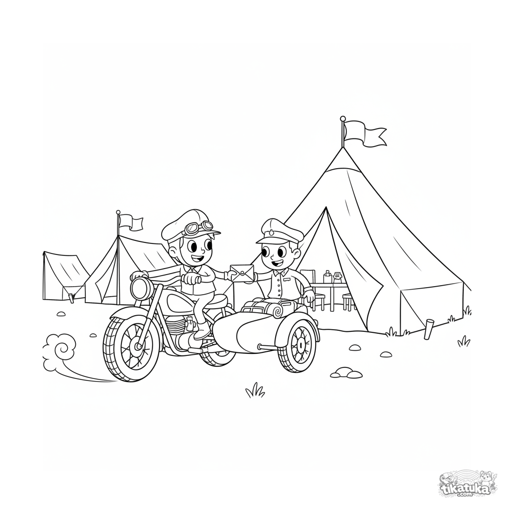 Página para colorir de uma motocicleta militar vintage com sidecar chegando ao QG. Para crianças de 4 a 6 anos. Mensageiro de óculos entrega um despacho, inclui barracas e nuvem de poeira.