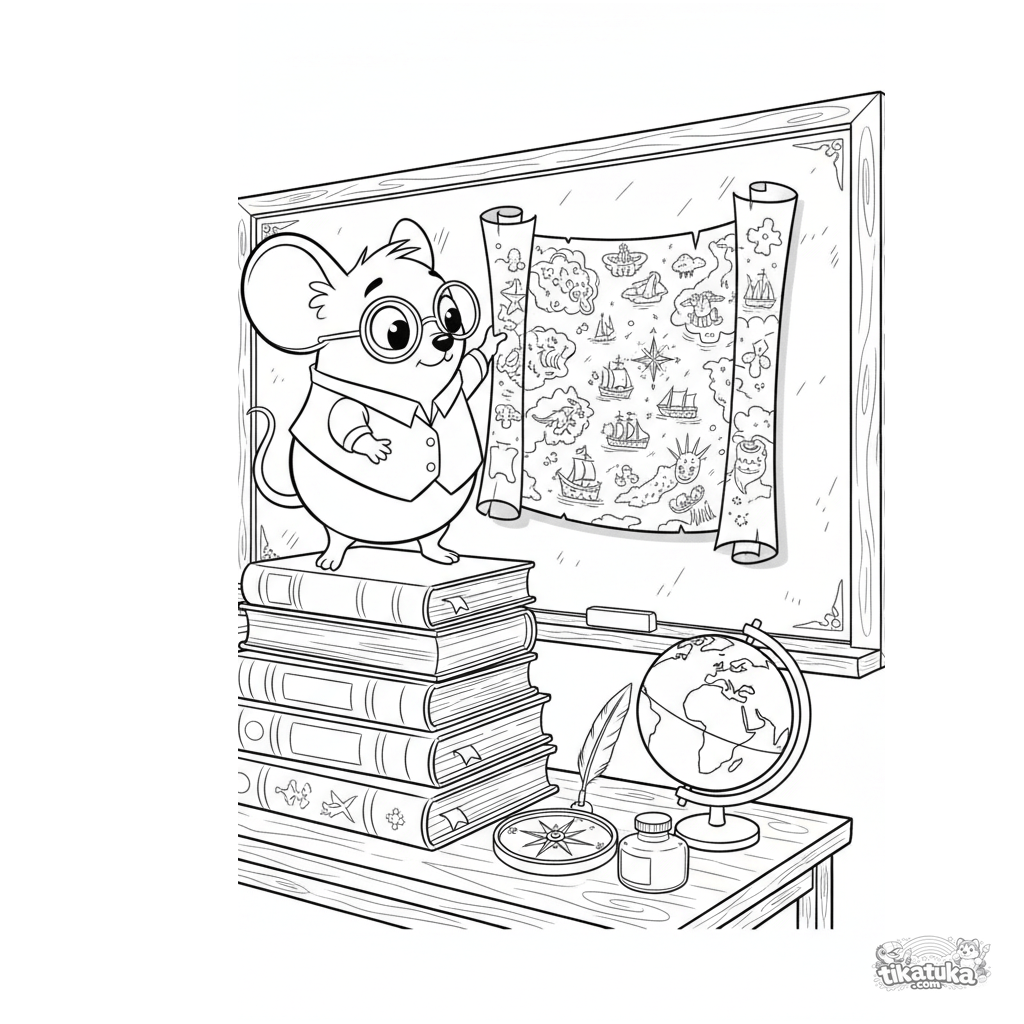 Página para colorir detalhada: um cartógrafo rato desenrola um mapa antigo no quadro da sala de aula. Para crianças de 10 a 12 anos. Detalhes: mapa, bússola, pena, globo, tinteiro.
