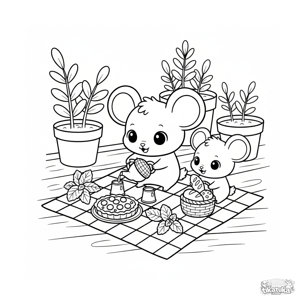 Página para colorir para crianças de 4-6 anos: uma família fofa de ratos faz um pequeno piquenique de chá no chão de uma varanda de verão.