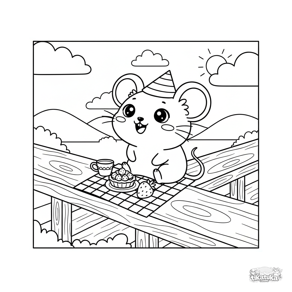 Página para colorir para pré-adolescentes 7-9: um ratinho de chapéu faz um piquenique no corrimão da varanda com uma torta de frutas vermelhas.
