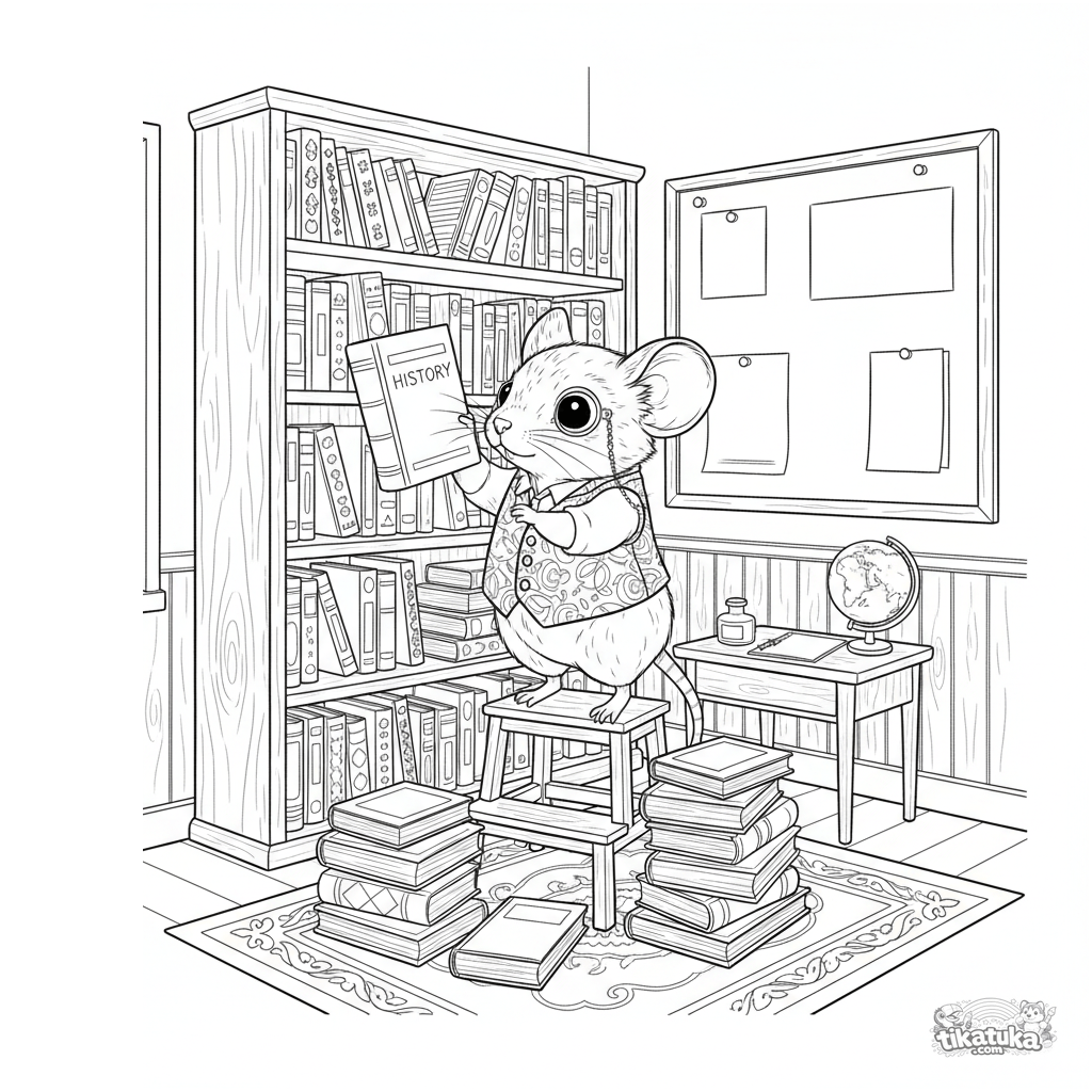 Página para colorir detalhada para crianças 10-12: um rato bibliotecário organiza livros em uma estante na sala de aula. Estilo naturalista, muitos elementos.