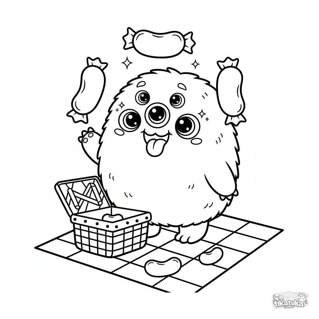 Página para colorir para crianças de 7-9 anos: um monstro chibi fofo de muitos olhos malabarizando jujubas em um piquenique.