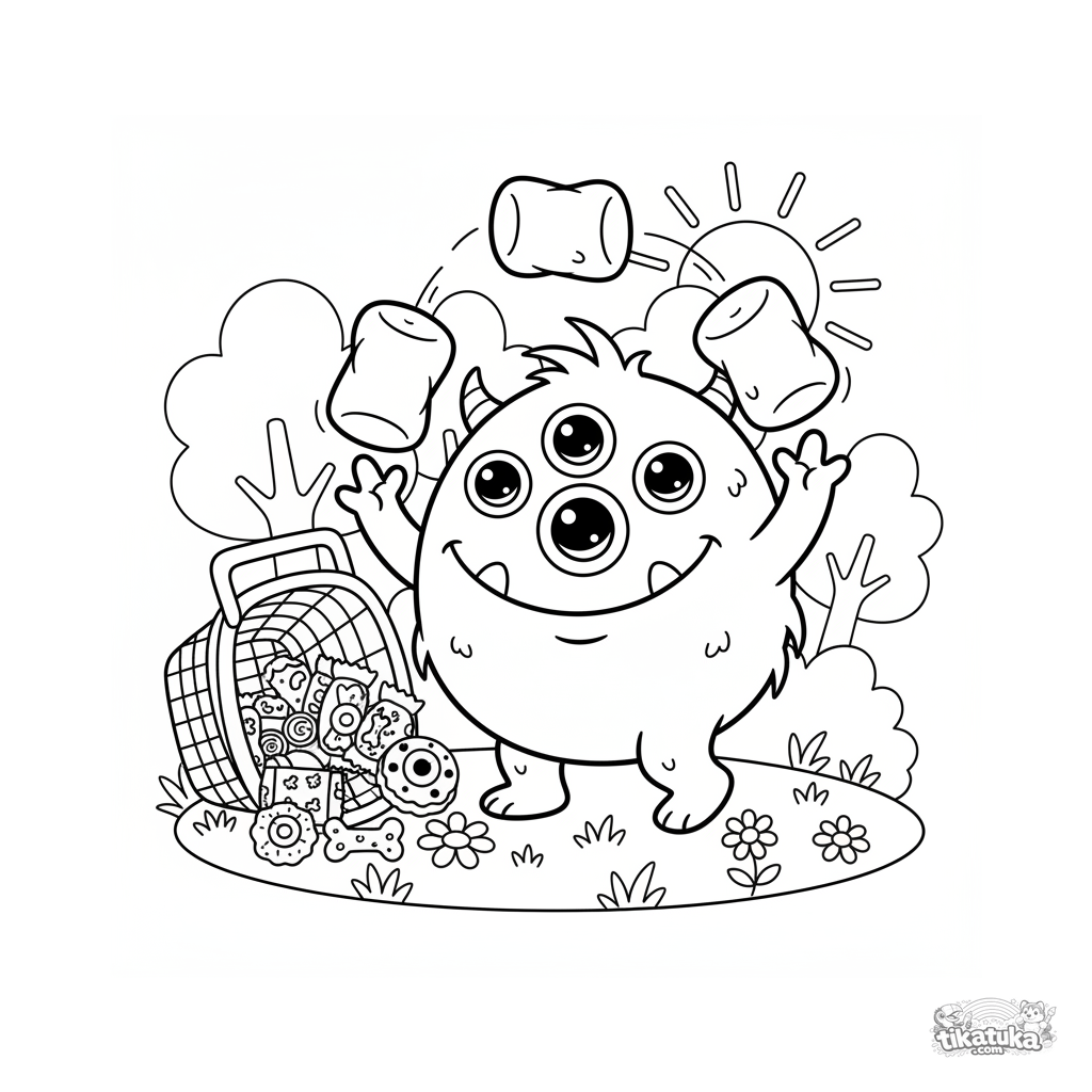 Página para colorir de um monstro de muitos olhos feliz fazendo malabarismos com marshmallows em um piquenique. Para crianças de 4 a 6 anos.