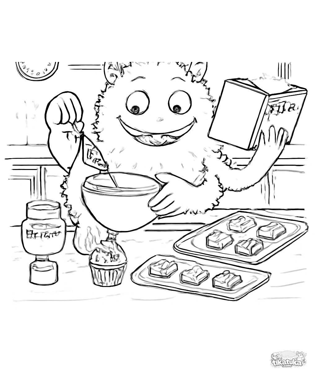 Página para colorir difícil e detalhada de um monstro de muitos braços assando bolinhos numa cozinha. Para 8-12 anos.